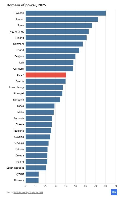 Οι άνισες θέσεις εξουσίας αποτελούν το μεγαλύτερο εμπόδιο για την ισότητα των φύλων στην Ευρωπαϊκή Ένωση, σύμφωνα με τον Δείκτη Ισότητας των Φύλων 2025 του EIGE. Οι βαθμολογίες στην κατηγορία «εξουσία», που αποτυπώνει την ισότητα σε θέσεις λήψης αποφάσεων, κυμαίνονται από 80,3 μονάδες στη Σουηδία έως 12,9 στην Ουγγαρία.