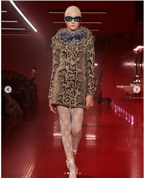 Φορώντας ένα πλεκτό μίνι φόρεμα με μοτίβο φιδιού και φτερωτό γιακά, η Κάι έκανε ένα δυναμικό πέρασμα στον κόσμο της υψηλής μόδας. Τα αξεσουάρ – μπεζ στέκα, γυαλιά Havana με μπλε φακούς, λευκές δαντελένιες κάλτσες και πέδιλα με λουράκι σε σχήμα τριαντάφυλλου – συμπλήρωσαν ένα look που συνδύαζε ρομαντισμό, τόλμη και σύγχρονη αισθητική.