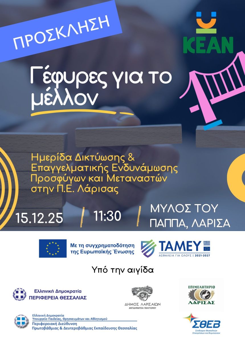 Η εκδήλωση τελεί υπό την αιγίδα της Περιφέρειας Θεσσαλίας, του Δήμου Λαρισαίων, του Επιμελητηρίου Λάρισας και του Σ.Θ.Ε.Β., αναδεικνύοντας τον κρίσιμο ρόλο της πρωτοβουλίας στην ενίσχυση της κοινωνικής ένταξης και της πρόσβασης σε ευκαιρίες απασχόλησης για πρόσφυγες και μετανάστες στην ευρύτερη περιοχή.