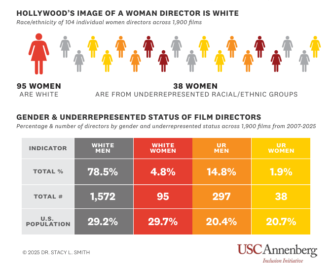 Ένα από τα πιο σύνθετα ευρήματα της έκθεσης αφορά τη φυλετική εκπροσώπηση. Το 24,3% των σκηνοθετών προερχόταν από υποεκπροσωπούμενες φυλετικές ομάδες. Για πρώτη φορά, οι έγχρωμες γυναίκες (5,4%) ξεπέρασαν αριθμητικά τις λευκές γυναίκες (2,7%). Παρότι πρόκειται για μια ιστορική μεταβολή, δεν αναιρεί το γεγονός ότι οι γυναίκες συνολικά παραμένουν δραματικά υποεκπροσωπούμενες, ειδικά στα έργα υψηλού προϋπολογισμού.