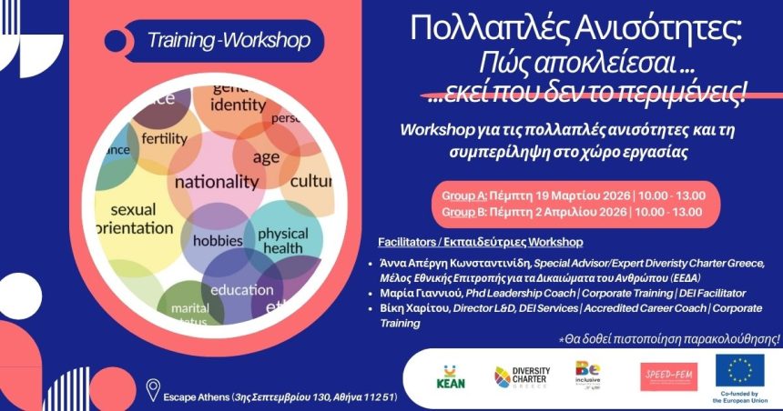 Ένα διαδραστικό/βιωματικό workshop με τίτλο «Πολλαπλές ανισότητες: Πώς αποκλείεσαι εκεί που δεν το περιμένεις» διοργανώνεται στην Αθήνα, με στόχο να ανοίξει τη συζήτηση γύρω από τις διασταυρούμενες μορφές ανισότητας, την ενδυνάμωση των εργαζομένων ατόμων και τις πρακτικές που μπορούν να συμβάλουν στη δημιουργία πιο συμπεριληπτικών οργανωσιακών κουλτουρών.
