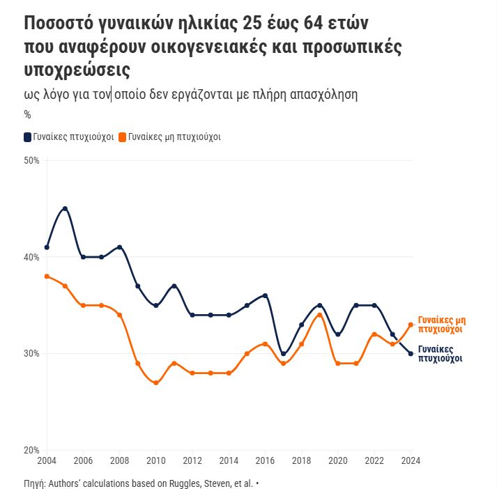 • Το 30% των πτυχιούχων γυναικών επικαλείται οικογενειακές ευθύνες (έναντι 41% πριν 20 χρόνια).