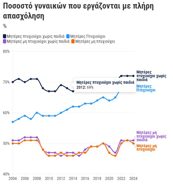 Από το 2004 έως το 2024, η πλήρης απασχόληση στις γυναίκες με πανεπιστημιακή μόρφωση αυξήθηκε εννέα ποσοστιαίες μονάδες, ενώ στις γυναίκες χωρίς πτυχίο μόλις μία. Η διαφορά είναι ακόμη πιο έντονη στις μητέρες: επτά στις δέκα γυναίκες με πανεπιστημιακές σπουδές εργάζονται πλήρως, σε αντίθεση με μόνο τις μισές μητέρες χωρίς πτυχίο.